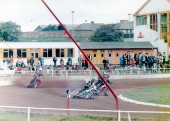 | The leading rider in Blue is Phil Kynman. Phil is at the apex of Brough Park's bends 3 and 4, just lining up for the home straight. Phil's skipper Tom Owen is assisting Phil to the chequered flag with Melvyn Taylor and Neil Leeks filling the minor places in a Newcastle 5-1 | ||||||
