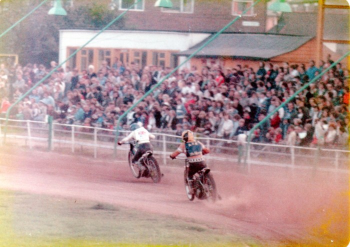 | Tom wasn't headed by many riders but Karl usually gave Tom a run for his money. Not sure which track and meeting this was but it isn't Brough Park. Karl looks to be in white and Tom y/b maybe it was in the second half down at Rye or an individual meeting somewhere else? | ||||||
